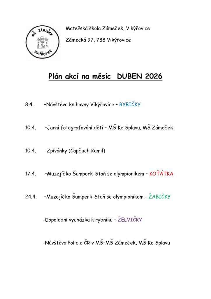 Plán akcí na měsíc DUBEN
