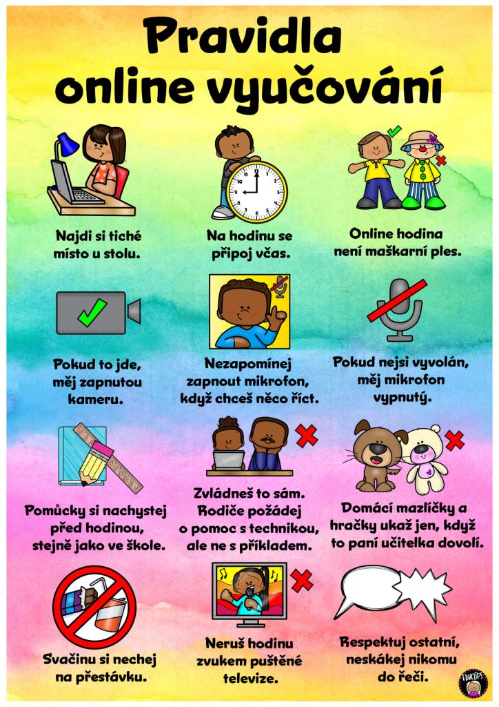 posílám obrázek, který shrnuje pravidla při distanční výuce. Každý určitě poznáte, který bod se týká právě Vašeho dítěte. Především u starších, prosím, aby testování byla práce jen Vašich dětí a ne rodičů. Starší žáci mají zakázáno chatování v průběhu dopolední výuky.