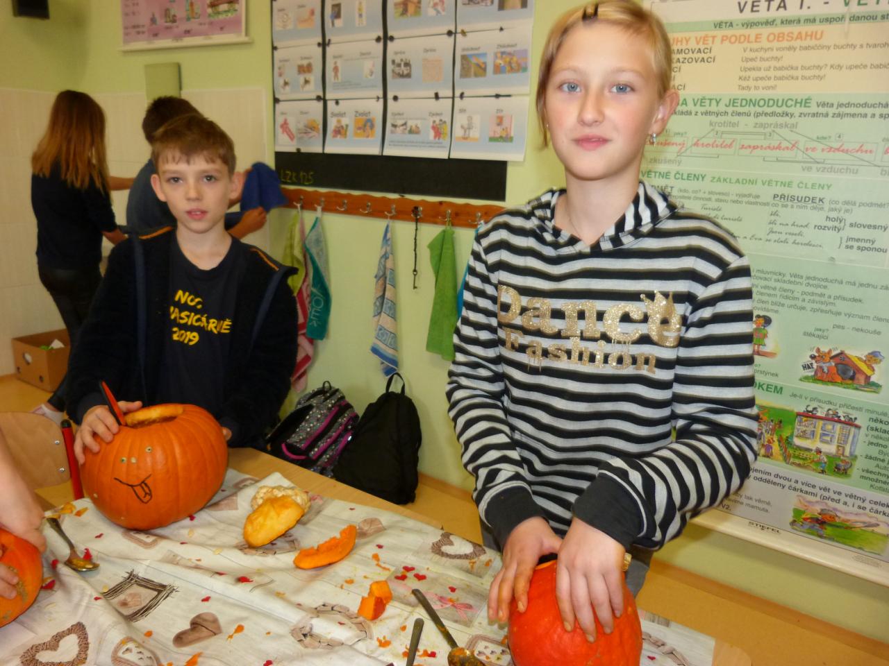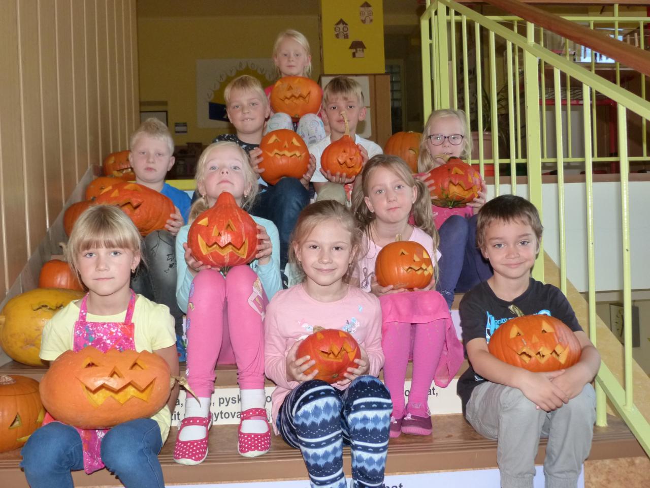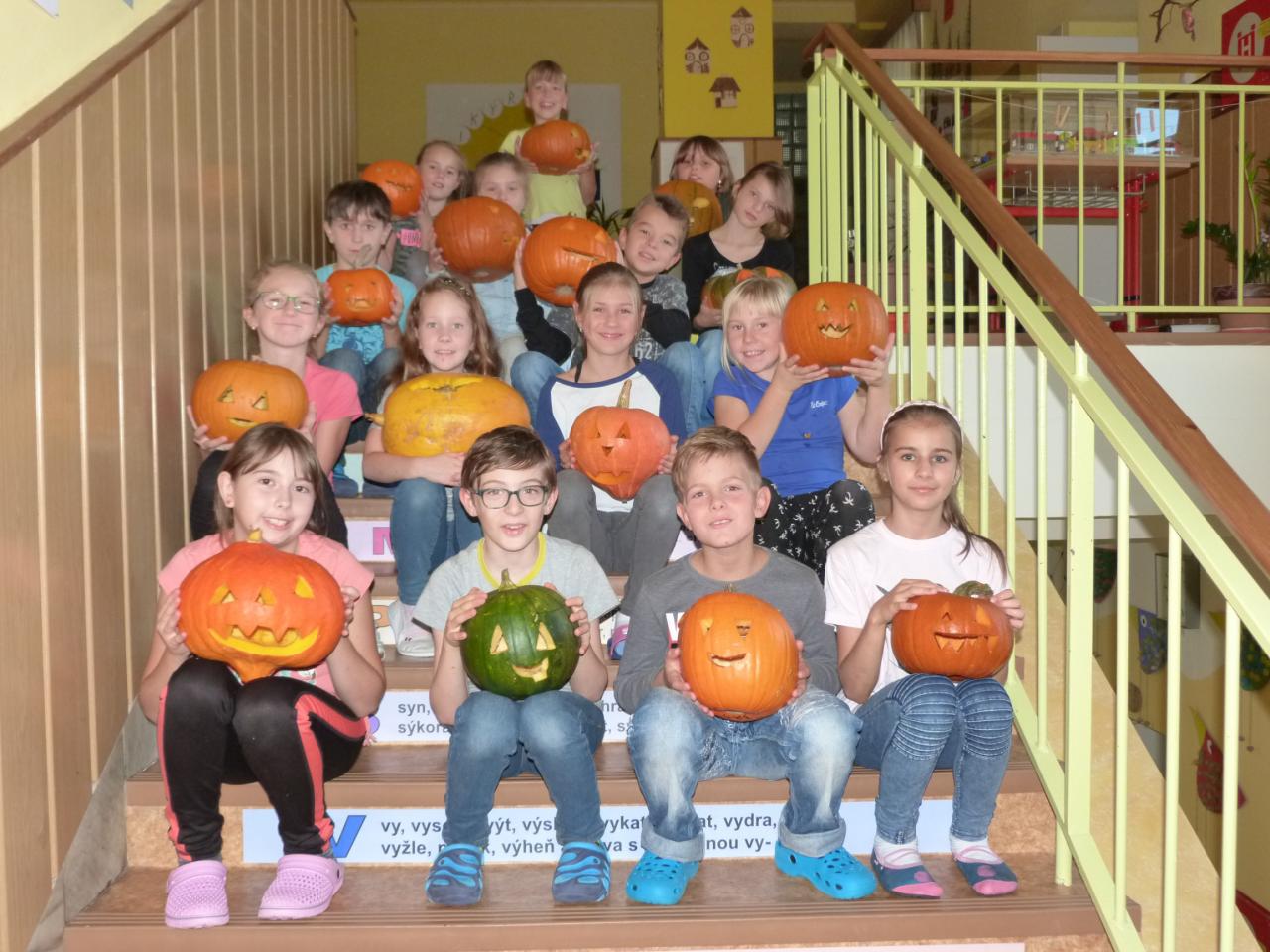 Halloween je lidový svátek, který má svůj původ v Irsku a nejvíce je oslavován v zemích, kde se mluví anglicky. Symbolem tohoto svátku je vyřezávaná dýně se zapálenou svíčkou. Postupně si získává oblibu i u nás, kdy se stává jakousi předzvěstí svátku Všech svatých neboli Dušiček. I na naší škole se začíná pomalu stávat tradicí, že si žáci nosí do školy dýně různých tvarů a velikostí. 24. října se pak společně s pedagogy pouští do práce. Každý si přeje, aby právě jeho dýně byla něčím zajímavá a originální. Že dlabání a vyřezávání je pořádná fuška, se přesvědčili všichni, Výsledek stál ale za to. Oranžové plody podzimu se postupně proměnily ve strašidelné i legrační obličeje, které ozdobily prostory školy a pomohly tak vytvořit příjemnou podzimní atmosféru.