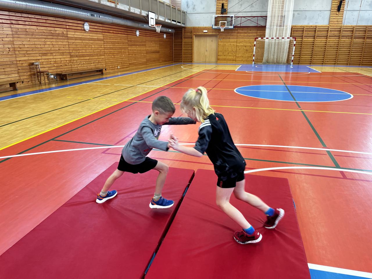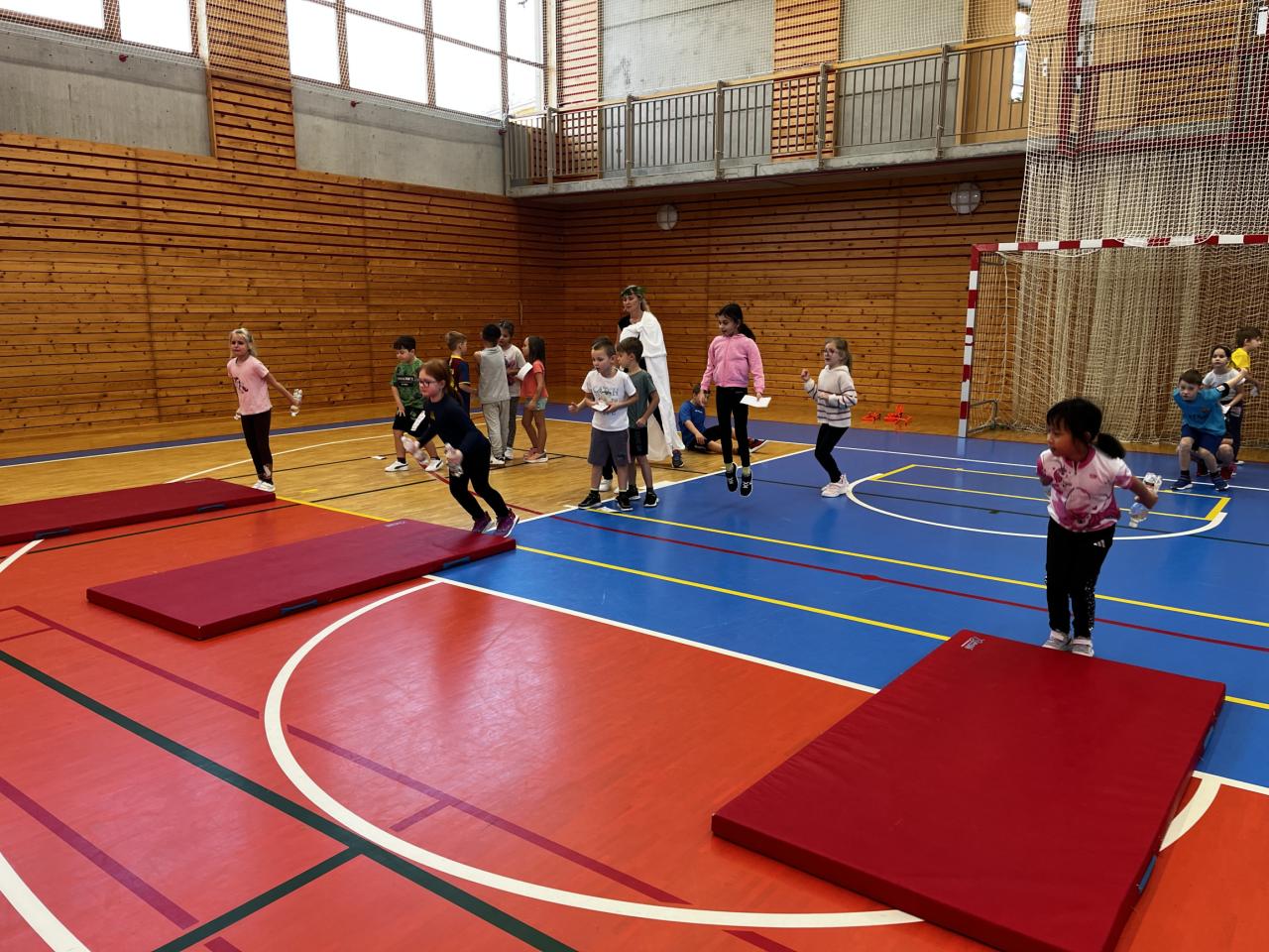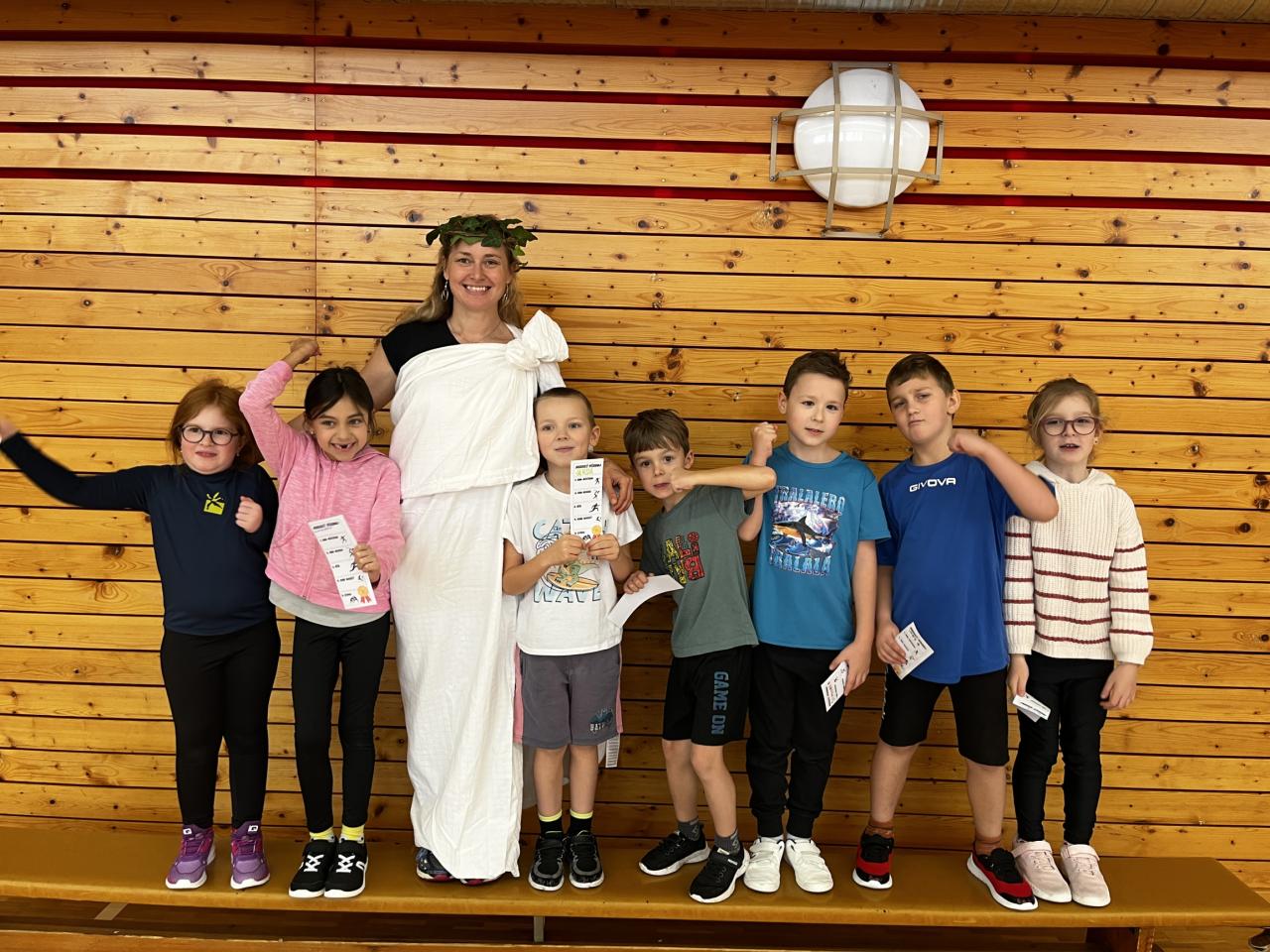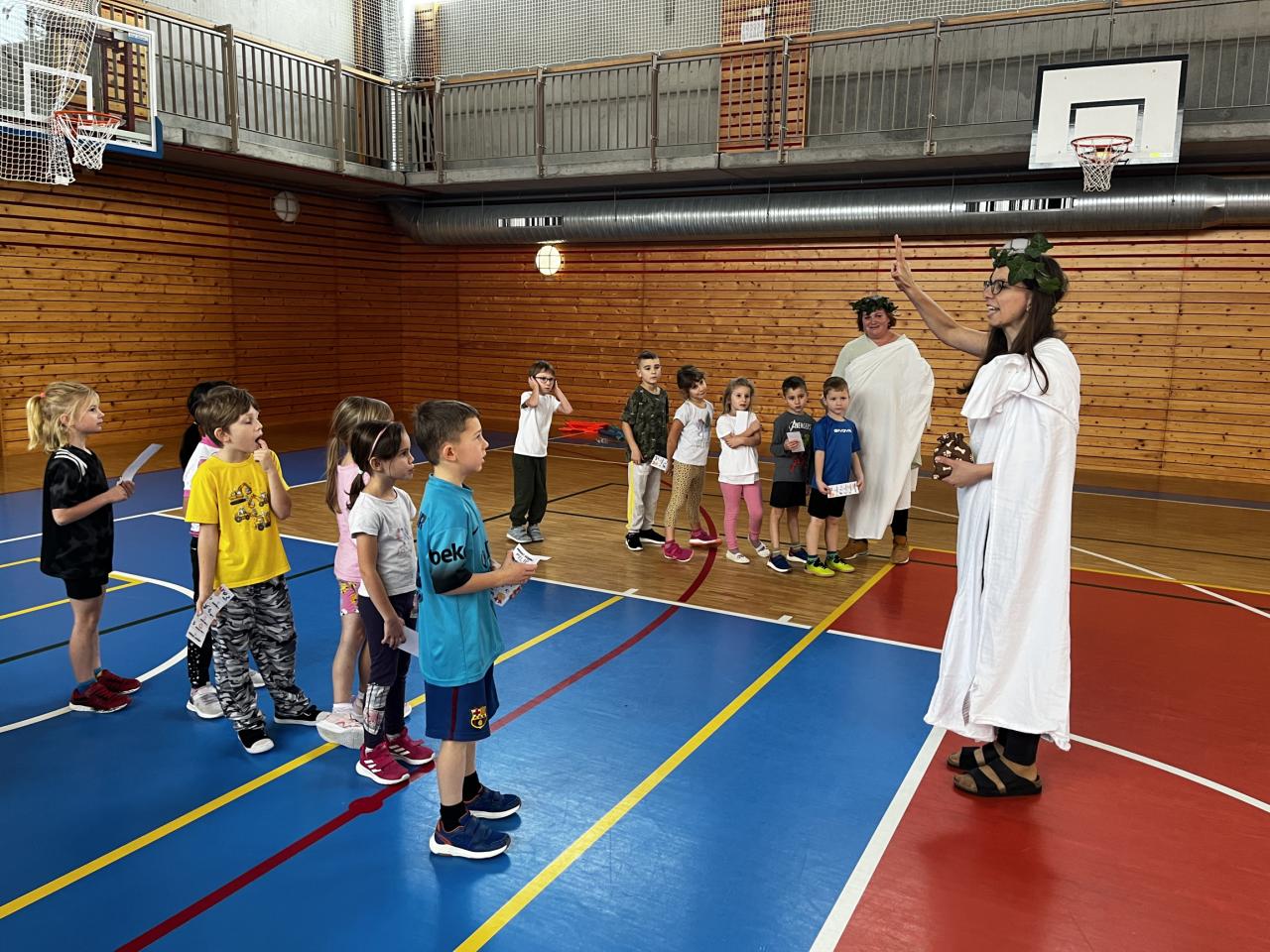 Antický pětiboj v podání žáků 1.A a 1.B pod dohledem bohyň z Olympu