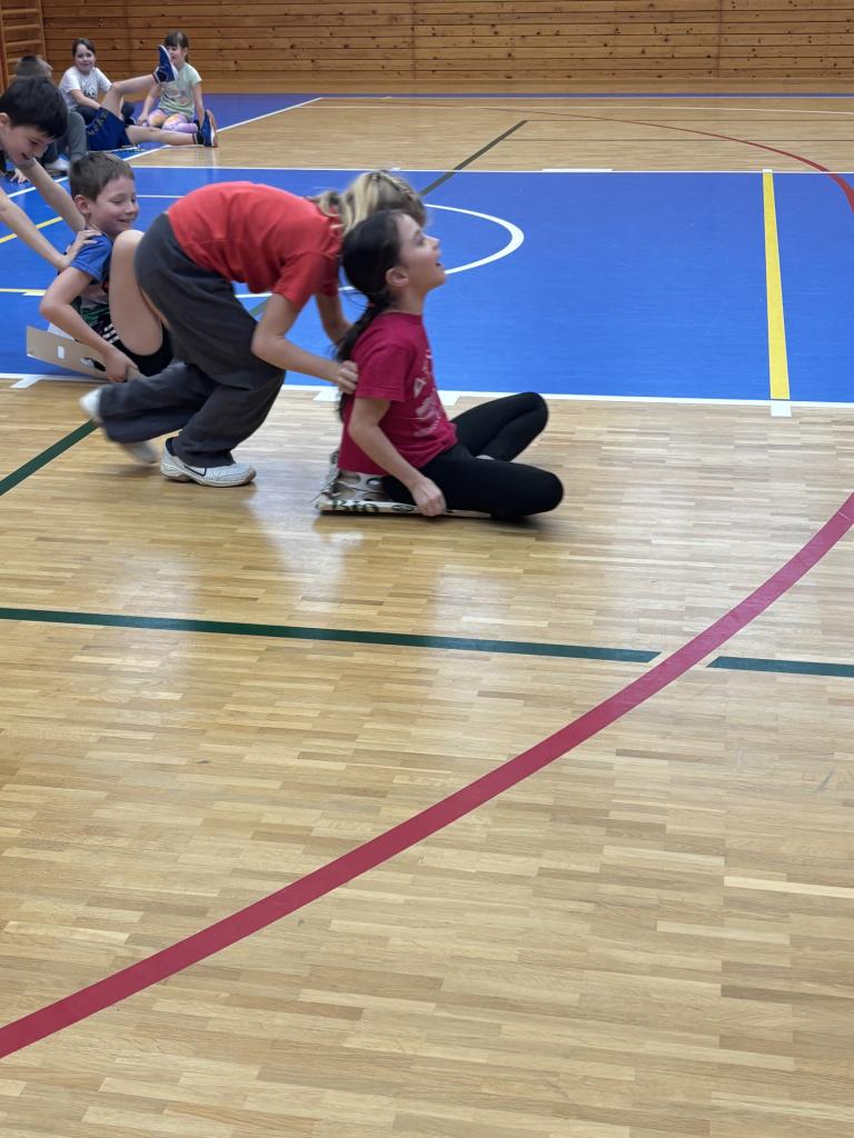 Trénink - spolupráce, síla, taktika... Závody v rychlobruslení- letáčky místo bruslí Závody bobů - krabice, kartony